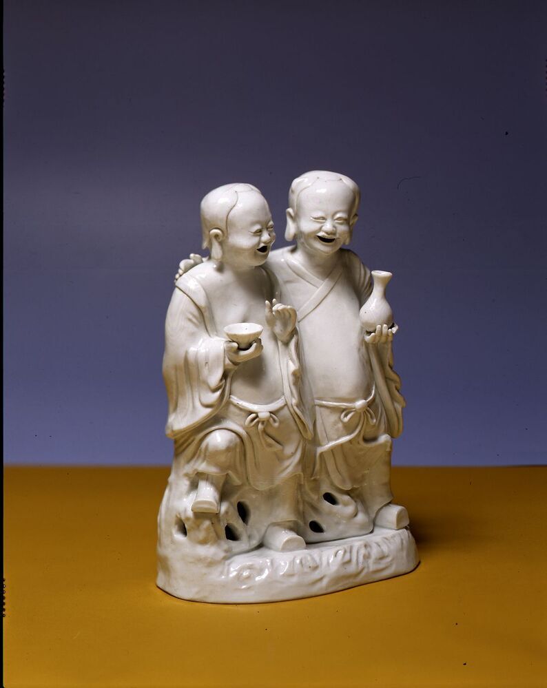 Mogelijk Hehe erxian (?), deze figuren hebben echter andere attributen vast (vaas en schaaltje). Normaal hebben Hehe erxian de lotusblad (he) en een doos (he) vast. Deze attributen verwijzen naar hun naam. (Nederlands)