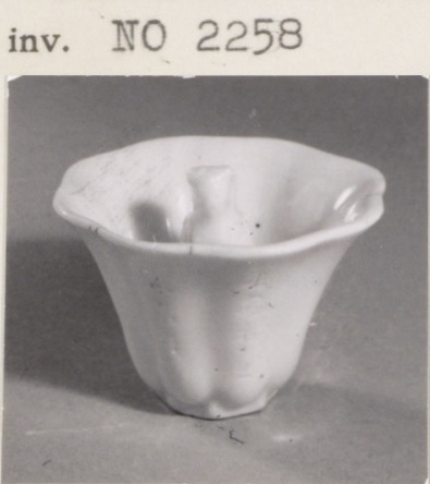 Fopkop, onderdeel van een fopkop op voetstuk, met inscriptie, blanc de chine. In het midden van de kop staat een figuur, waarschijnlijk een van de Acht Ontsterfelijken. In het Chinees worden dit soort kommen 公道杯 'gong dao bei' genoemd, wat 'gerechtigsheids kop' betekent. Het wordt ook wel vertaald als 'wees niet gulzig', wat met de werking van het kopje te maken heeft; in de holte van de figuur zitten gaatjes, als je teveel vloeistof in het kopje doet druppelt het eronder weer uit. Het gedicht 飲中八仙歌 (Yin zhong ba xian ge) is van de dichter Du Fu (712-770) en is een ode aan de Acht Ontsterfelijken en hun drinkgedrag. (Nederlands)