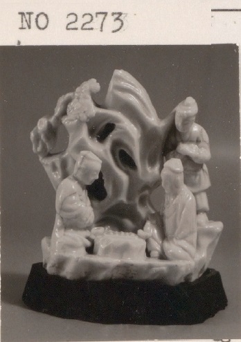 Beeld in vorm van drie figuren bij rots, blanc de chine, op een voetstuk. (Nederlands)