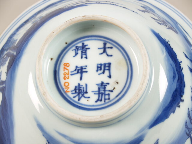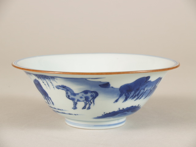 Kom beschilderd in onderglazuur blauw en met een bruine rand. Aan de buitenkant een decor van acht paarden in een landschap. De binnenkant is ongedecoreerd. Op de bodem een dubbele ring met het zes-karakter merk van de keizer Jiajing. Blauw-wit Samen staan de paarden voor het verhaal van Koning Mu (r. 1001–947 B.C.). Koning Mu maakte tijdens zijn leven vele avonturen mee. Na afloop daarvan liet hij zijn acht favoriete paarden los in een vallei, waar ze verzorgd werden door zijn paardenmenner. (Nederlands)