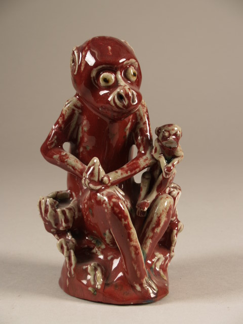 Beeld van een zittende aap bedekt met rood-groen glazuur. Zijn linkerhand is gevuld met een perzik en rust op zijn rechterbeen. Op zijn andere been zit een jonge aap. De binnekant van de beeld is hol. (Nederlands)