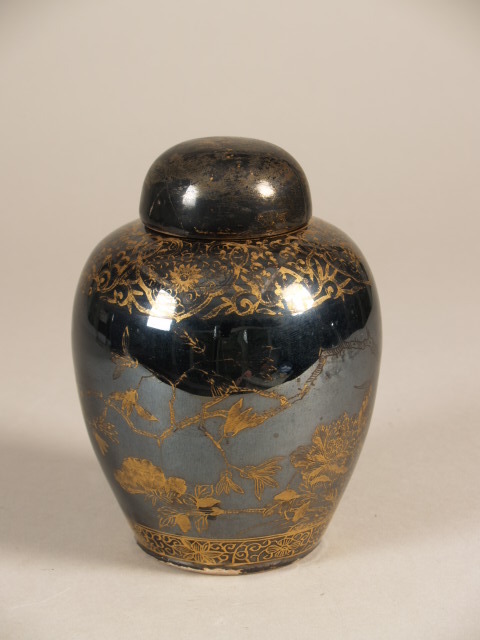 Pot met deksel, bedekt met zwart glazuur en decor van vogels en bloemtakken, gehoogd in goud (Nederlands)