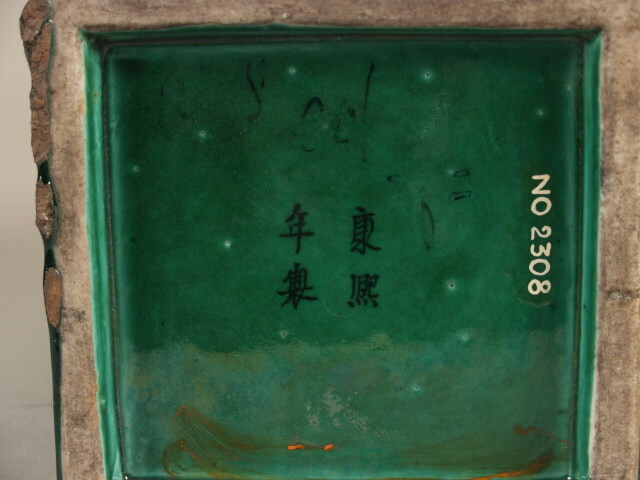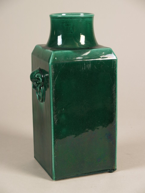 Vierkante vaas met monochroom groen glazuur. Aan weerszijden twee handvaten in de vorm van een leeuwenkop met een ring. Op de bodem een vier karakter Kangxi merk. (Nederlands)