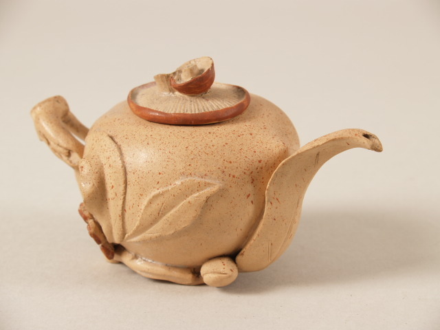 Theepot in de vorm van een perzik en een deksel in de vorm van een omgekeerde paddenstoel (Nederlands)