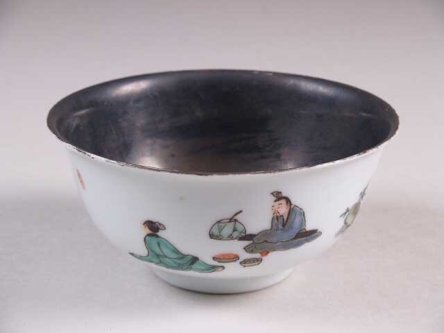 Kom met decor van figuren op wit fond en zwart gelakte binnenzijde, famille verte