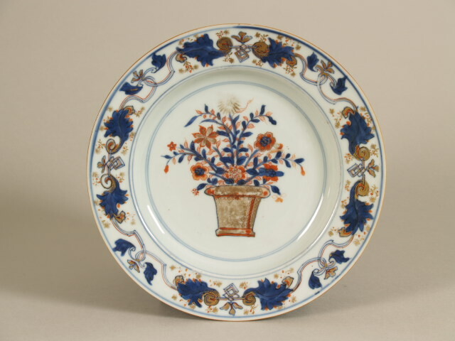 Bord met decor van bloempot met bloeiende planten, imari (Nederlands)