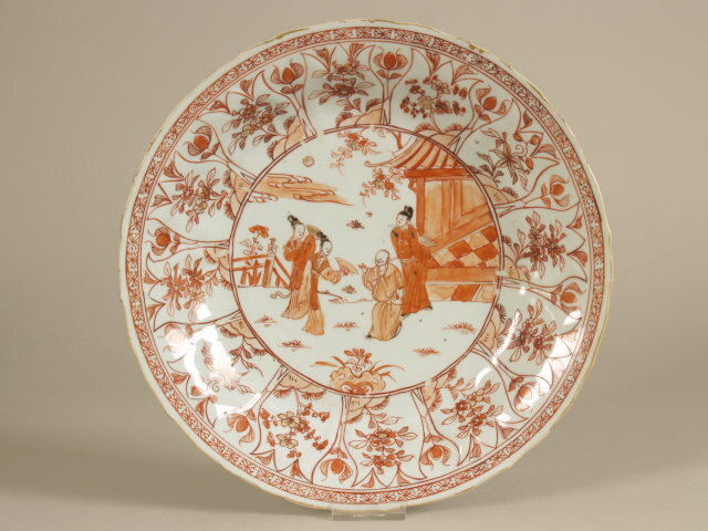 | Nederlands | Schotel met decor van tuinterras met 2 dames die waaiers dragen, melk en bloed |