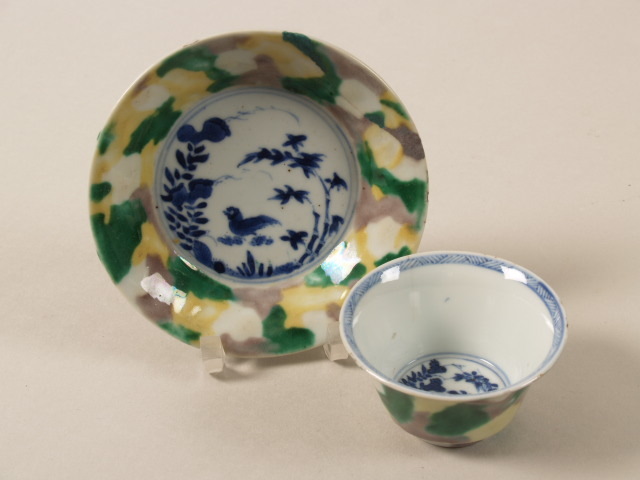 | Nederlands | Kop en schotel met decor van vogel, bamboe en bladrank en een band van spinach and egg |