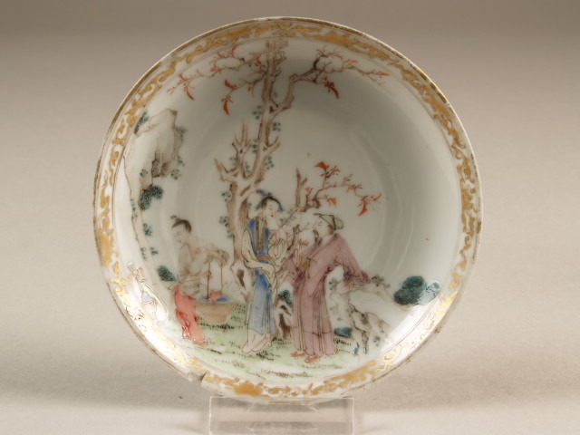 Schotel met decor van 3 figuren bij boom in tuin (Nederlands)