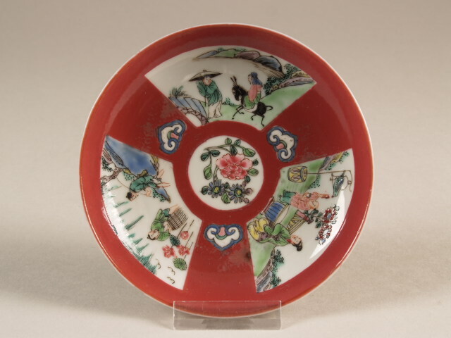 Schoteltje met decor van vakken waarin landschapjes met figuren tegen een roze fond, famille rose (Nederlands)