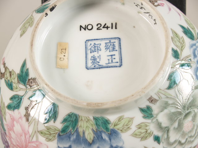 onder op de bodem in blauw émail: Yongzheng "Yung-chêng yu chih" (gemaakt op keizerlijke bestelling van Yung-chêng)? (Nederlands)