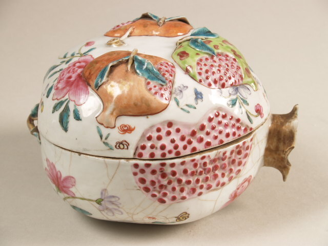 Doos met deksel in de vorm van granaatappel beschilderd in roze, goud, oranje, groen, blauw, bruin en wit. De doos heeft een decoratie in reliëf van granaatappels en bloemtakken. Famille rose (Nederlands)