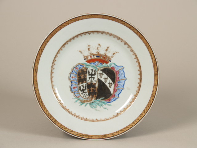 Bord gedecoreerd met het alliantiewapen van de families De Famars en Vriesen, chine de commande, famille rose. Bord langs de rand gedecoreerd met een meanderband in goud en grisaille en langs de wand een spearhead band. Op het plat het alliantiewapen van de families De Famars en Vriesen bestaande uit, aan de linkerzijde, een gevierendeeld wapen met alternerend fleurs-de-lis en een adelaar. Aan de rechterzijde een wapen met een schuine balk met daarin drie zwarte koeienkoppen. Dit wapenservies is, kort na hun huwelijk in 1752, besteld door Jan Willem de Famars (1715-1785) en Mechteld Johanna Geertruid Vriesen (1734-1807). (Nederlands)