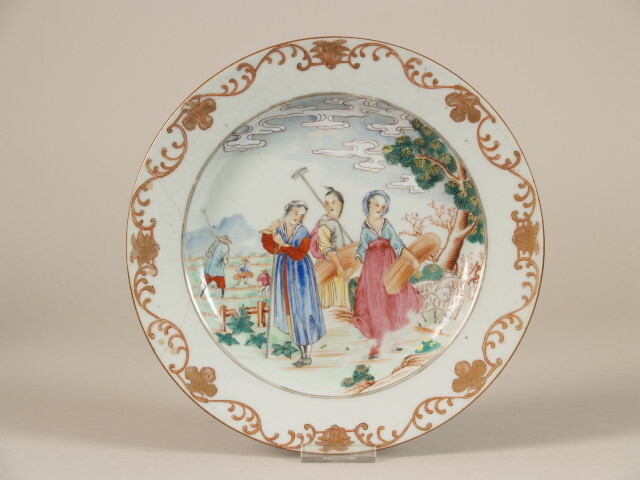 Bord met decor van 3 westers geklede dames die op het land werken, chine de commende, famille rose (Nederlands)
