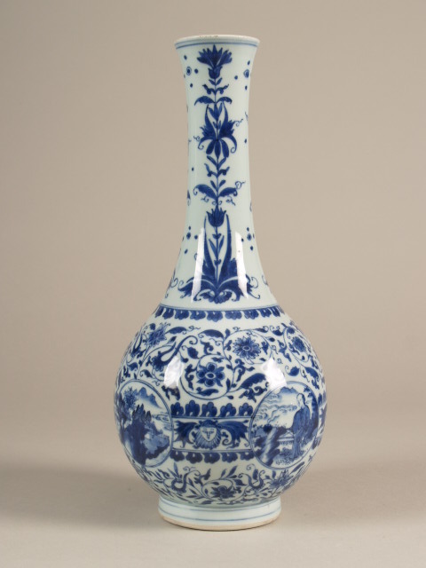 Vaas met decor van rivierlandschappen, medusakopjes en krullende bloemranken (Nederlands)