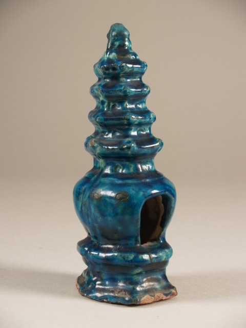 Beeld in de vorm van een pagode met 4 verdiepingen en bedekt met turquoise glazuur (Nederlands)