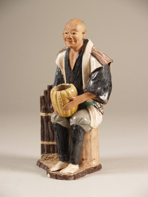 Beeld in de vorm een man, staand, met mand in de handen (Nederlands)