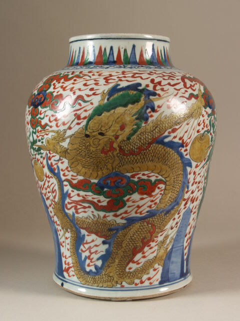 | Nederlands | Pot met decor van draken en vlammende parels |
