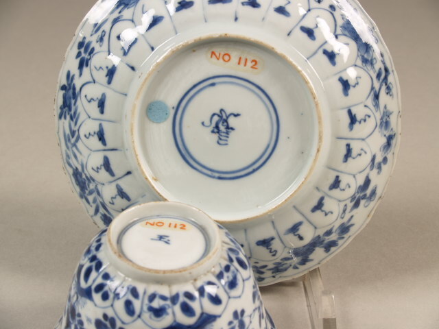 In kobaltblauw op de bodem; kop: het aanbevelingsmerk jade in een dubbele cirkel. Schotel: een conch-shell (oorschelp) in een dubbele cirkel. (Nederlands)