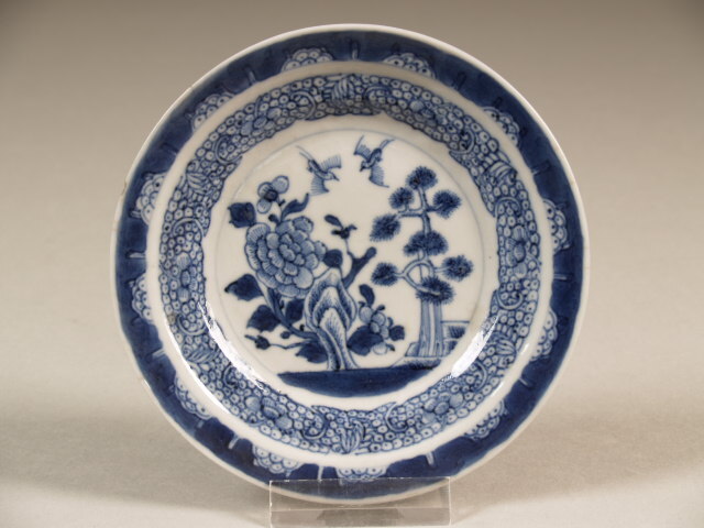 | Nederlands | Schotel met decor van pijnboom, pioenroos en rotspartij |