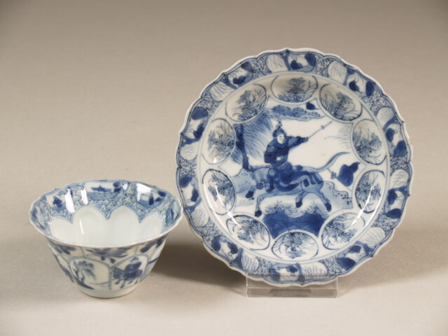 Kop en schotel met geschulpte rand met decor van ruiter te paard (Q23562)