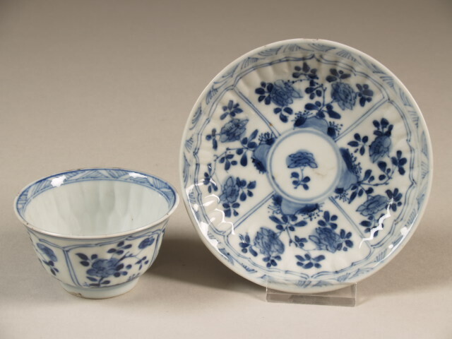 Kop en schotel met decor van vakken waarin bloemen (Q23564)