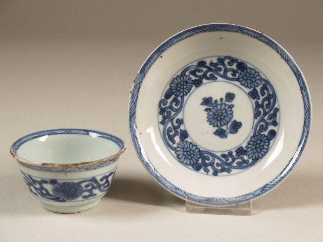 Kop en schotel met decor van band waartussen krullende bloemtak (Q23571)