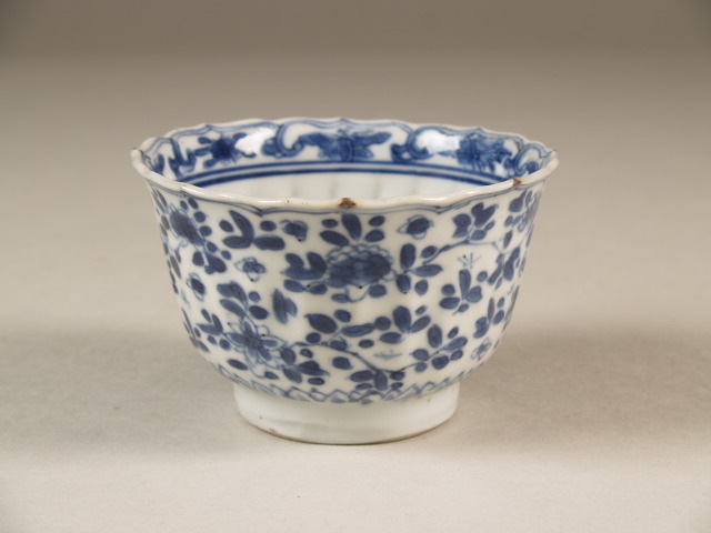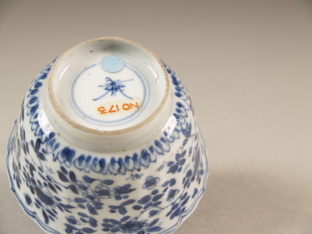 Op de bodem in kobaltblauw een gekalligrafeerde lingzi in een dubbele cirkel. (Nederlands)