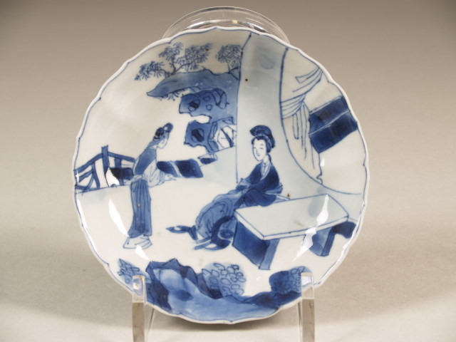 Schoteltje met geschulpte rand en decor van tuin met huis en 2 vrouwen (Nederlands)