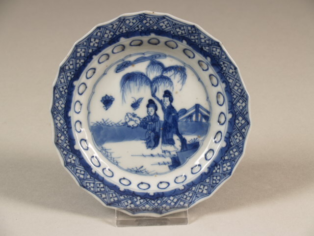 | Nederlands | Schoteltje met decor van 2 vrouwen en 2 parende konijnen in een tuinlandschap |