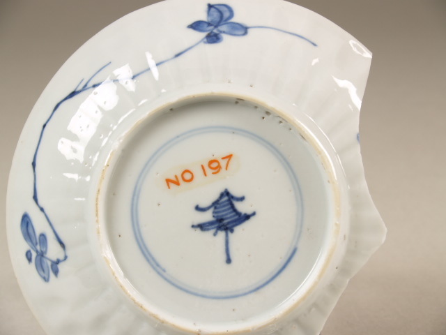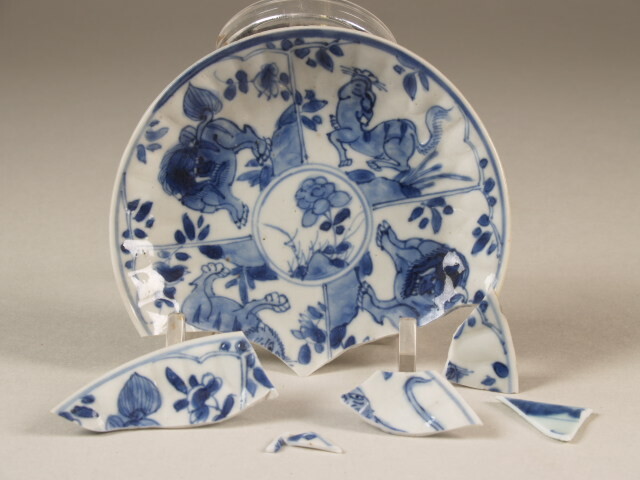 Op de bodem in kobaltblauw een lingzi in een dubbele cirkel. (Nederlands)