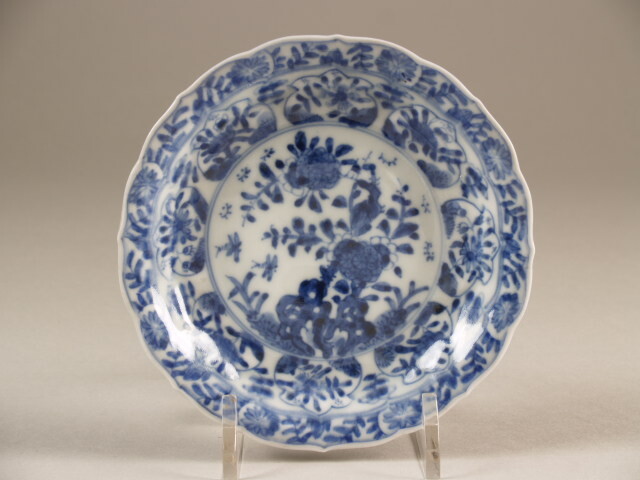 Schotel met geschulpte rand met decor van granaatappelvormige vlakken met bloemranken (Nederlands)