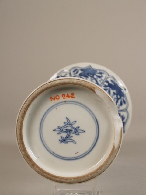 Op de bodem in kobaltblauw een lingzi in een dubbele cirkel. (Nederlands)