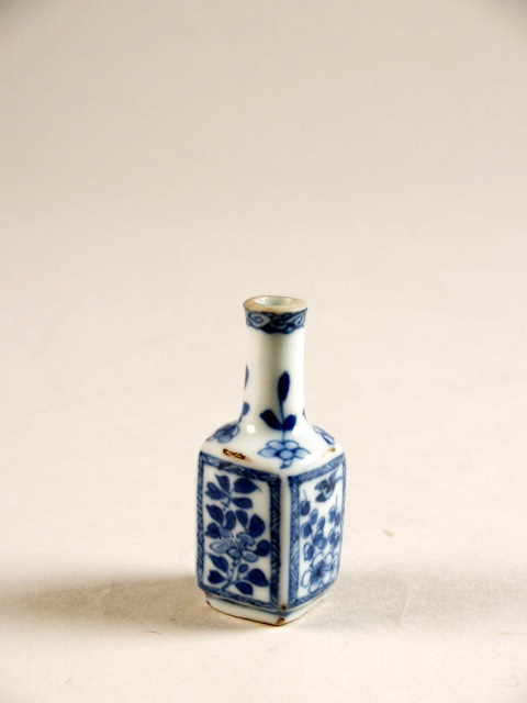 Miniatuurfles met vierkante basis en met decor van bloeiende planten in vakken (Q23671)