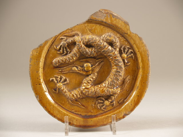 Dakpan, dan wel fragment van een nokdakpan, met decor van draak in reliëf