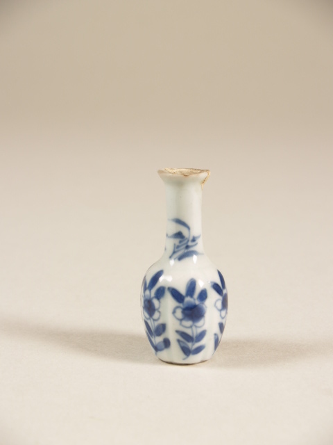 | Nederlands | Miniatuurfles met decor van staande bloemen in onderglazuur blauw op de geribbelde buik |