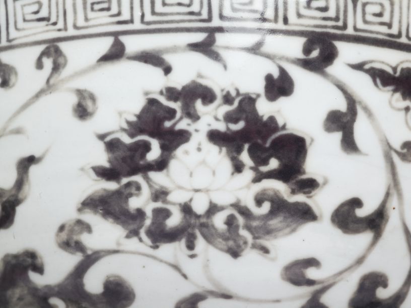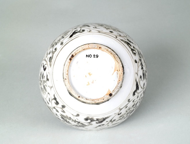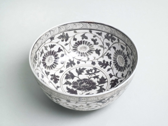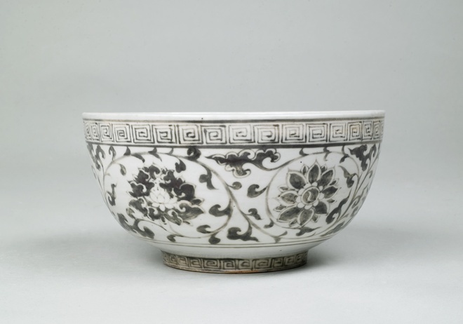 Kom met decor van krullende ranken, onderglazuur koperrood (Nederlands)