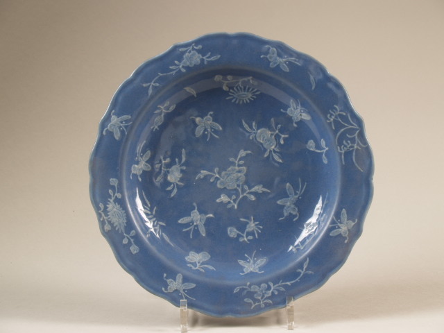 | Nederlands | Schotel met golvende rand, blauw geglazuurd, met decor van bloemen en insecten in wit slib |