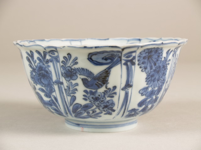 Kraaikop met decor van vakken waarin een bloemtak of een vogel op een rots (Nederlands)