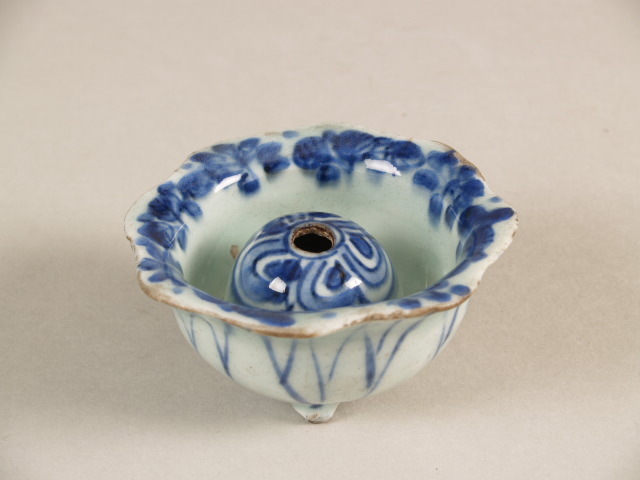 In het midden van de kop staat een figuur (hier verdwenen), waarschijnlijk een van de Acht Ontsterfelijken. In het Chine...tjes, als je teveel vloeistof in het kopje doet druppelt het eronder weer uit.||China||Keramiekmuseum Princessehof NO 00320 |