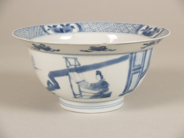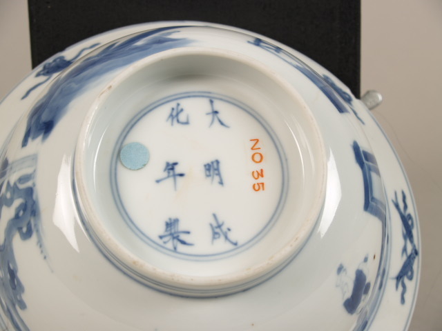 Op de bodem in kobaltblauw een vertikaal Chenghua zesmerk in dubbele cirkel. (Nederlands)