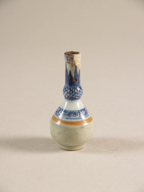 Miniatuurfles, onderste deel monochroom celadon, bovenste deel met decor van bloemen en ruiten (Nederlands)
