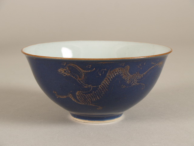 Kom, blauw, met decor van gouden draken (Nederlands)