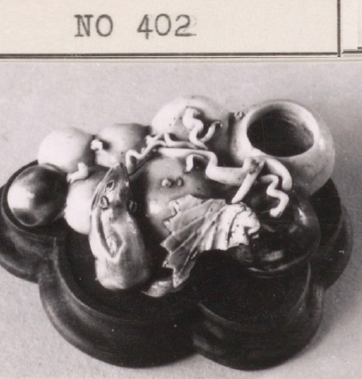 Waterbakje in de vorm van een druiventros met een eekhoorn op een voetstuk. (Nederlands)