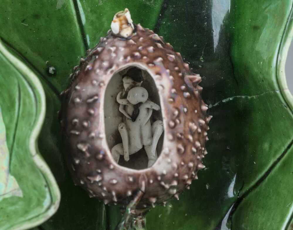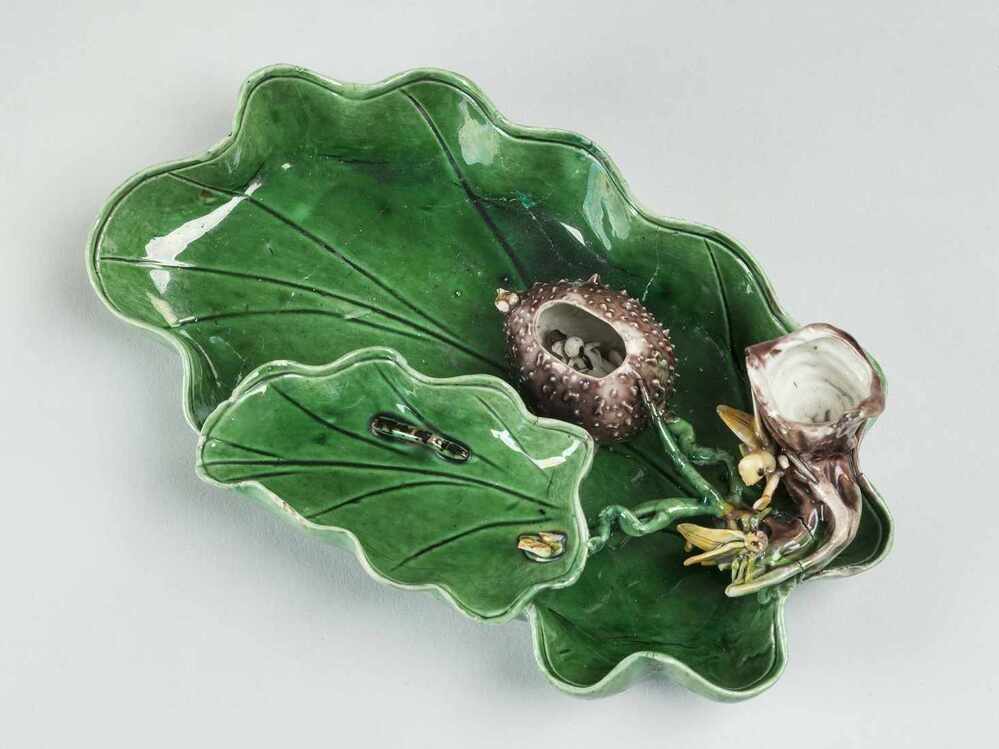 Waterbakje in de vorm van een moerbeiblad met in de vrucht verborgen een vrijend paartje.||China||Keramiekmuseum Princessehof NO 00407 |