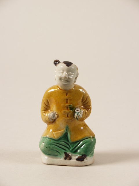 Beeld in de vorm een man, zittend, gekleed in groene broek en gele driekwart jas (Nederlands)