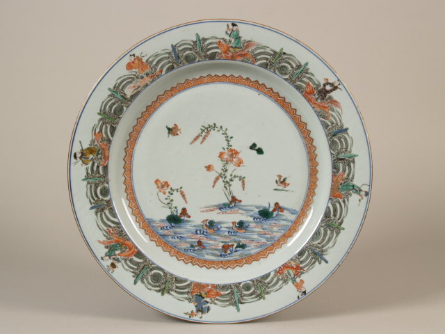 | Nederlands | Schotel met decor van eenden in vijver en 8 onsterfelijkheden, famille verte |