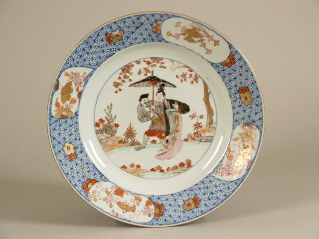 Bord met decor van rozetten en dame met een parasoldrager, vlinder, vleermuis en insecten, imari (Nederlands)