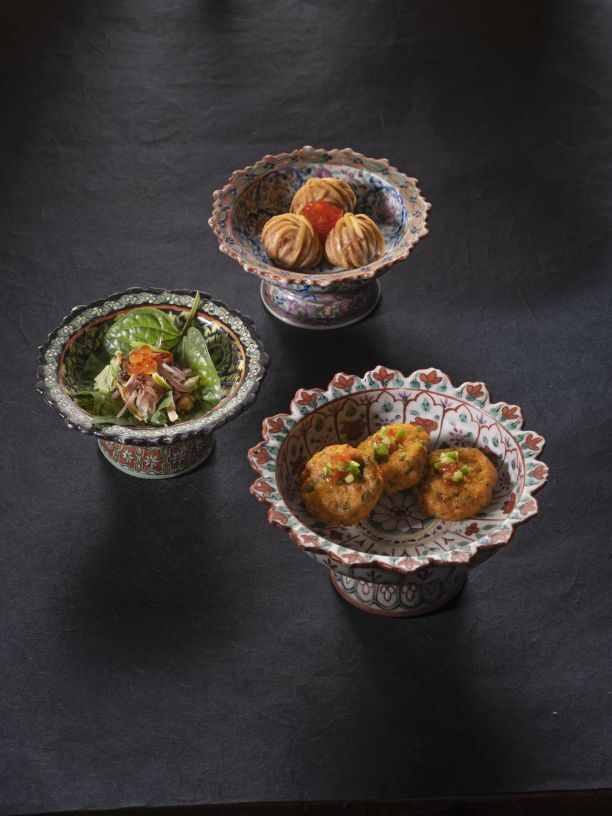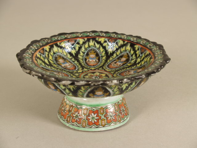Schaal op voet met decor van 8 vlammende medaillons en 8 halve mannelijke figuren, Bencharong (Q23853)
