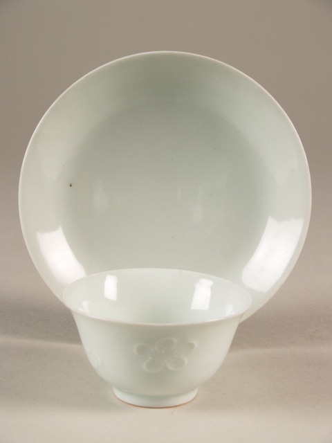 Kop en schotel met floraal decor in licht reliëf (Nederlands)
